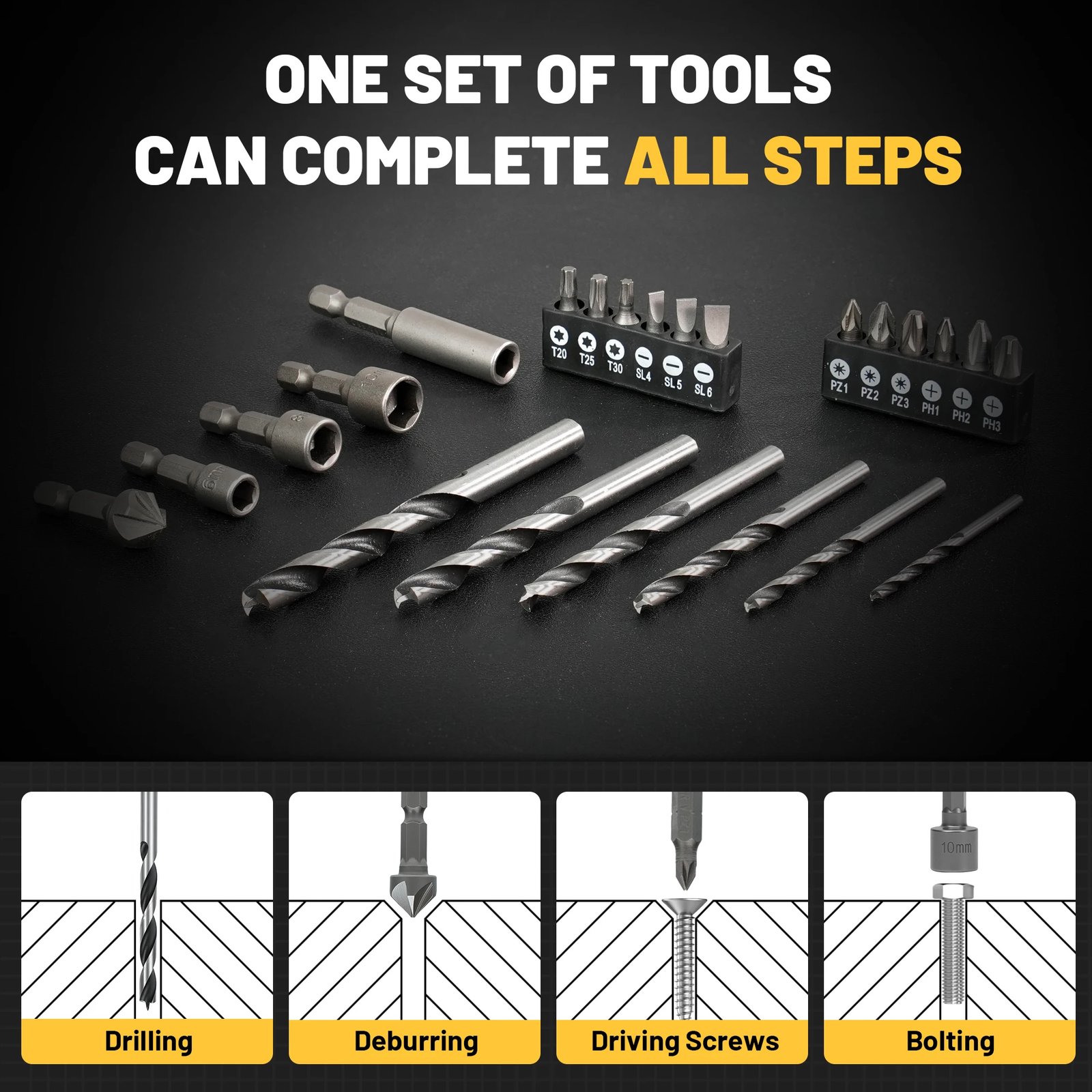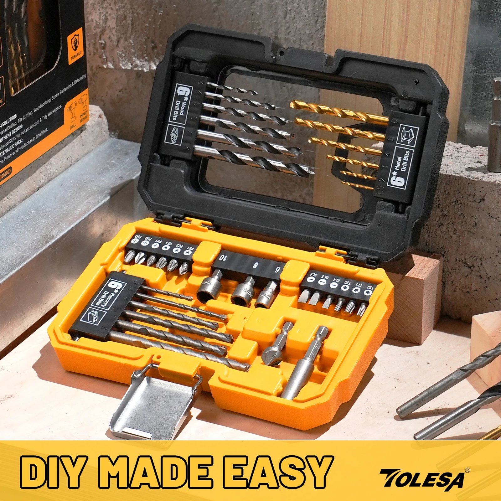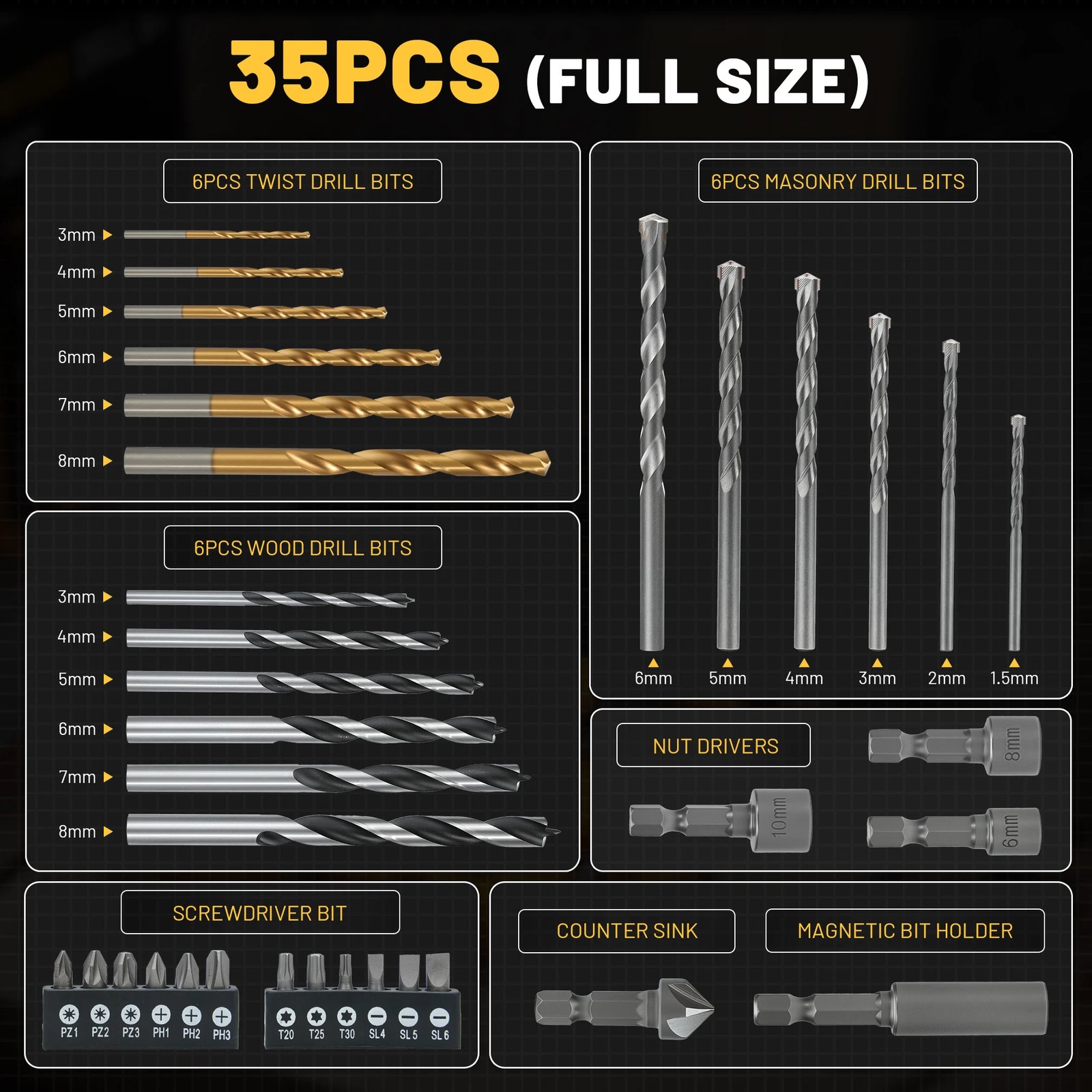 Made from carbon steel and high- speed steel, this 35- piece drill bit set is designed for durability and precise drilling. Suitable for metal, wood, plastic, and masonry, it is ideal for DIY projects, home maintenance, and workshop use.
