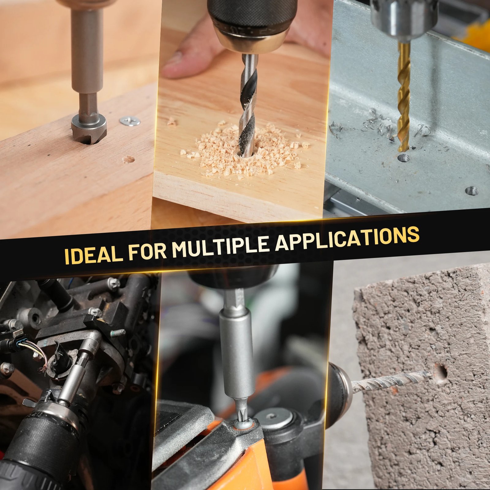 - Drill bits for metal, wood, plastic, and masonry