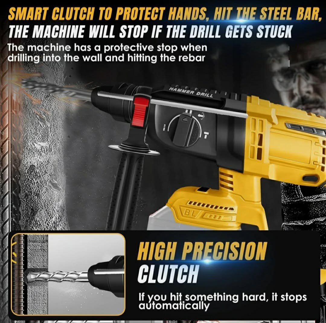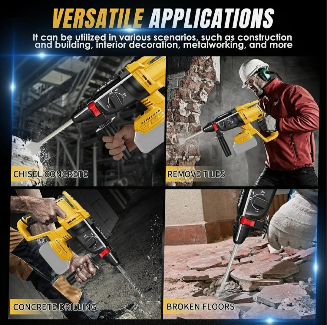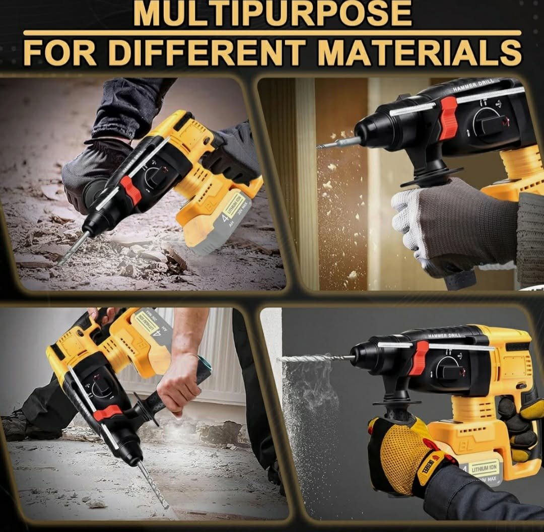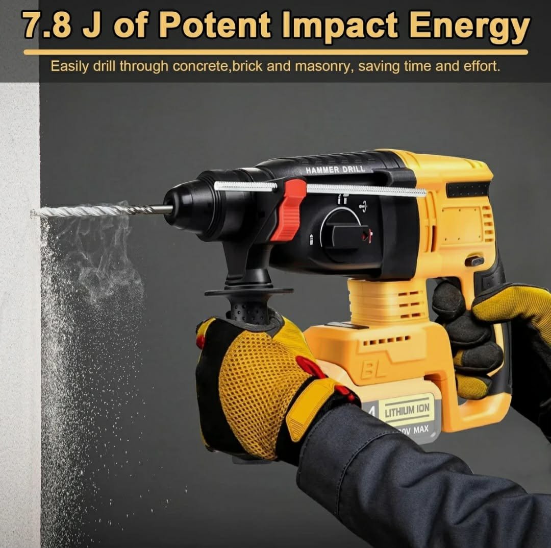 The brushless cordless SDS+ rotary hammer drill is designed for demanding drilling and light demolition applications in construction, renovation, and workshop environments. Built for compatibility with DeWalt 18V/20V battery systems, this body-only unit allows you to integrate seamlessly into your existing cordless tool setup. Powered by a brushless motor, the drill is engineered to support efficient energy transfer while reducing mechanical wear. As a result, it delivers consistent performance across a variety of tasks, including masonry drilling and general installation work. The SDS+ chuck system enables secure bit retention and quick changes without additional tools. This rotary hammer features four operating modes: standard drilling, hammer drilling, chiselling, and position adjustment. Therefore, it is suitable for drilling into brick, concrete, wood, and metal when used with appropriate bits. The ergonomic grip design supports comfort during extended use, while the auxiliary handle provides improved control and stability. Designed for both professional tradespeople and serious DIY users, the compact body ensures balanced handling. Additionally, integrated cooling vents help regulate operating temperature during continuous use.