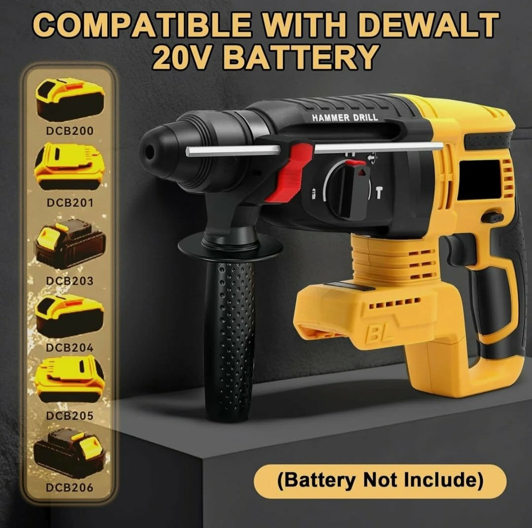 Battery compatibility: DeWalt 18V / 20V MAX style batteries Package includes: Drill body, auxiliary handle, depth rod, user manualExplore more compatible tools in our