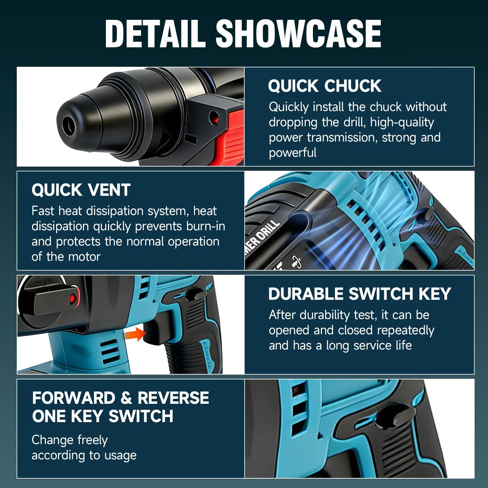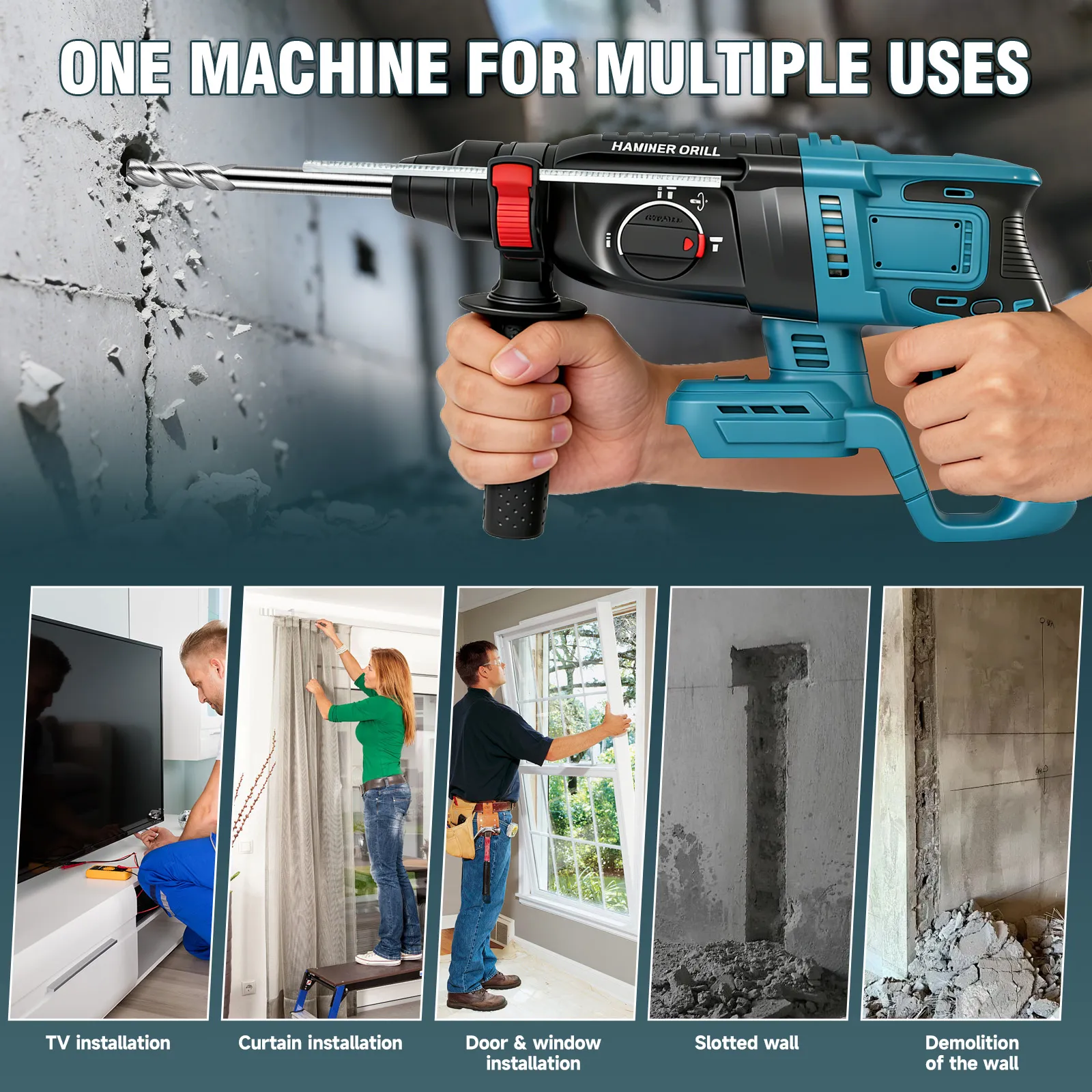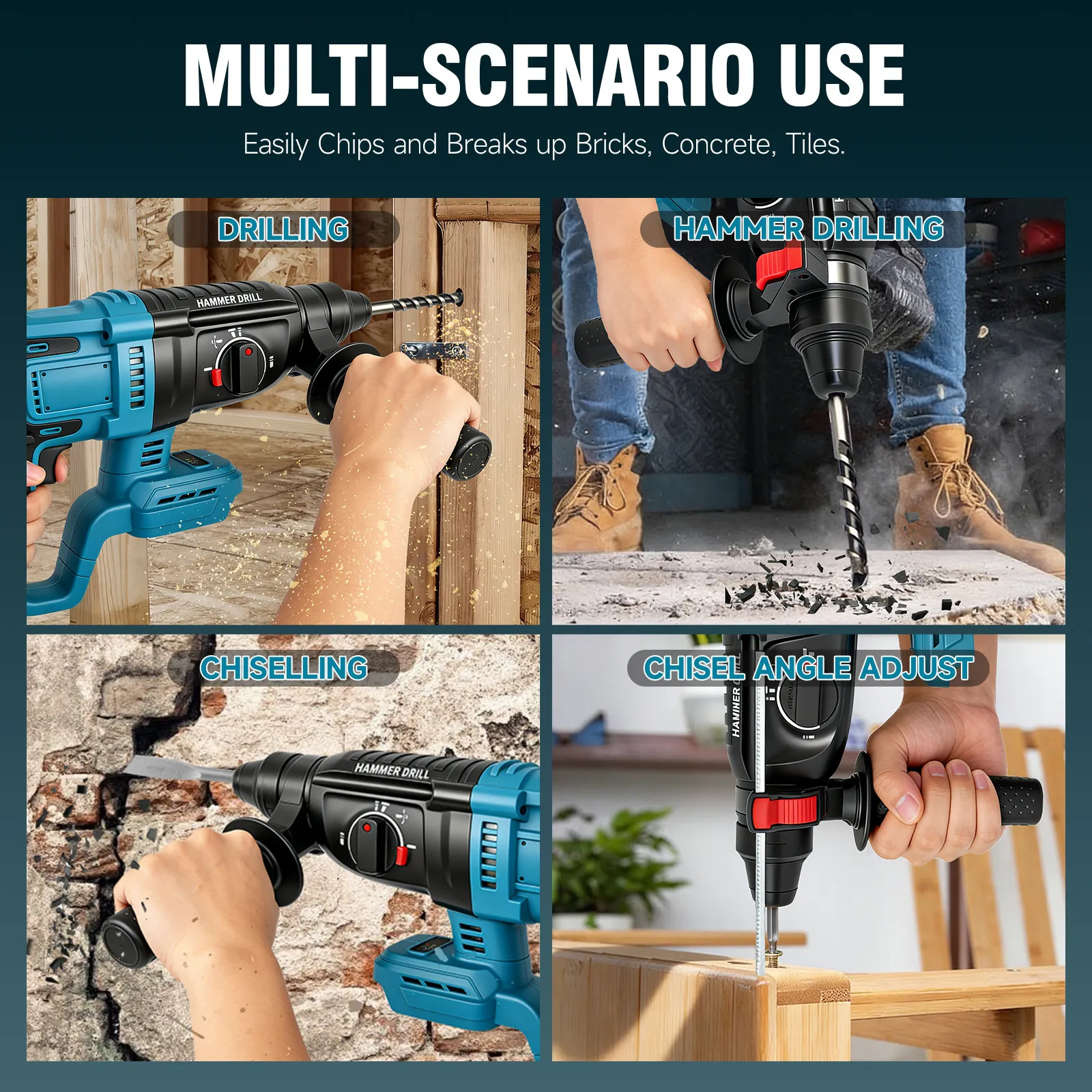 - Functions: Drill, Hammer Drill, Chisel, Position Adjustment